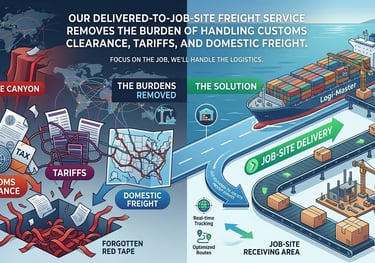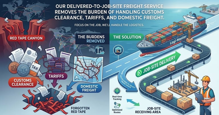 Our delivered-to-job-site freight service removes the burden of handling customs clearance, tariffs, and domestic freight.